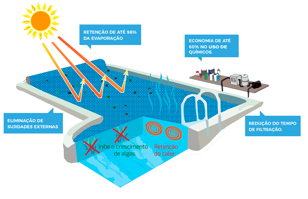 A Capa Térmica para Piscina ATCO® impede que sujeiras, folhas, insetos e outros resíduos entrem na piscina, eles não são apenas desagradáveis visualmente como também são alimentos para algas e bactérias.